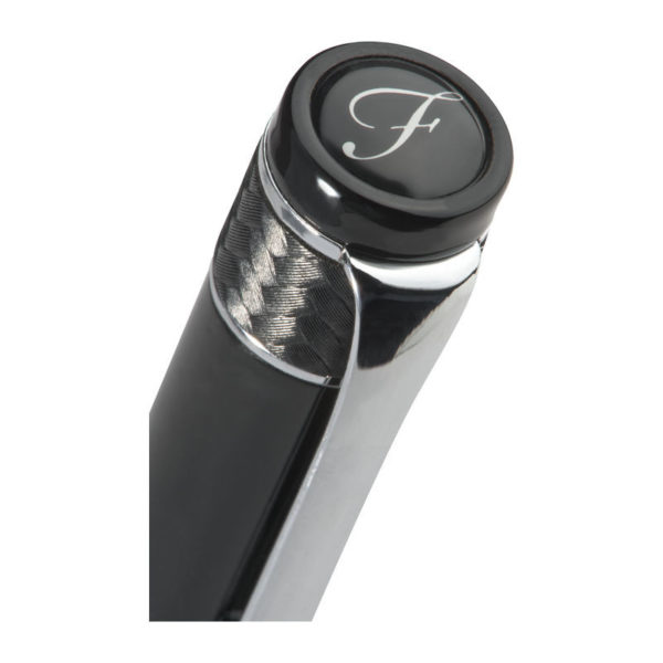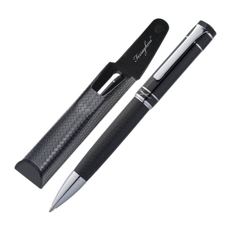Luxusní Ferraghini kuličkové pero s twist mechanismem. Kombinace černého lakovaného povrchu a mřížkované designu je zvýrazněna s pochromovanými ozdobami. Modro-psací kuličkové pero je uloženo v polstrovaném pouzdře z umělé kůže s magnetickým uzávěrem.